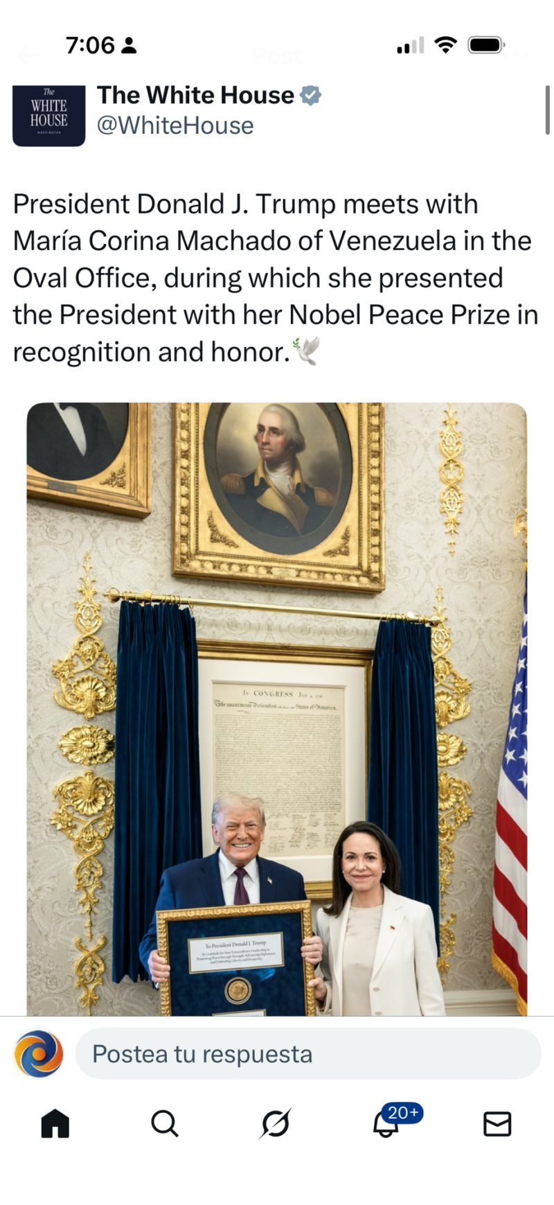 Trump acepta la medalla del Premio Nobel de la Paz del líder de la oposición venezolana Machado